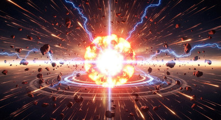 Explosive cosmic collision of asteroids in deep space with planets and glowing energy bursts.