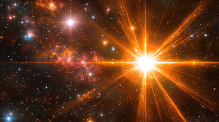 A vibrant star releases intense solar flares, illuminating the surrounding cosmic expande with bright energy.