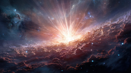 A cataclysmic stellar explosion radiates immense energy and light across the cosmos. This powerful supernova represents concepts of creation, destruction, a big bang, and the origins of the universe, serving as a metaphor for a powerful breakthrough or a new beginning.