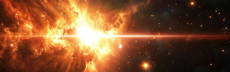 A breathtaking cosmic explosion radiates intense orange and yellow colors against the backdrop of deep space, with twinkling stars scattered throughout the scene.