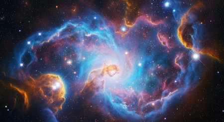 A stunning nebula showcases brilliant shades of blue, purple, and orange, revealing cosmic gas and stars in deep space.