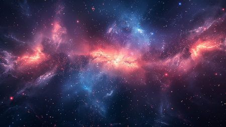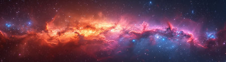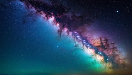A panoramic view of the Milky Way galaxy, showcasing vibrant colors, sparkling stars, and swirling cosmic dust.
