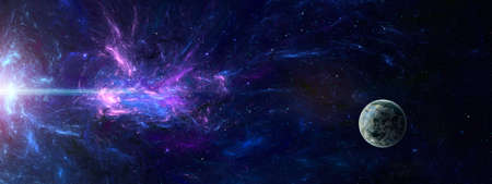 Space scene, background, web banner. Colorful fractal nebula with planet. 3D rendering