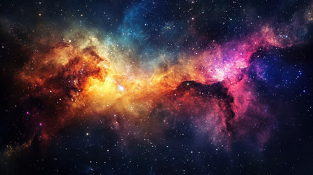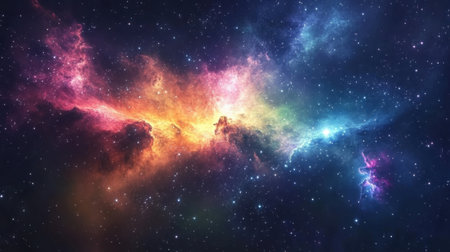 Nebula night starry sky in rainbow colors. Multicolor outer space. Star field and nebula in deep space many light years far from planet Earth.