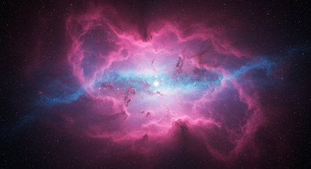 A breathtaking view of cosmic clouds illuminated in pink and blue tones, capturing the wonder of the universe and the mysteries within deep space.