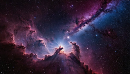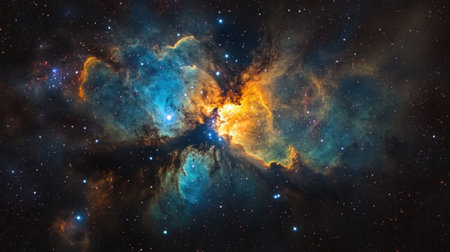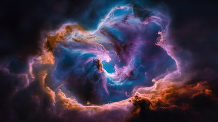 Colorful gas and dust clouds converge in a nebula, highlighting brilliant light sources from faraway stars. This cosmic spectacle reveals the beauty and complexity of the universe.