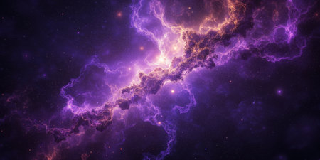 A vibrant nebula glows with purple and blue hues, studded with bright stars and cosmic dust in the vastness of deep space.