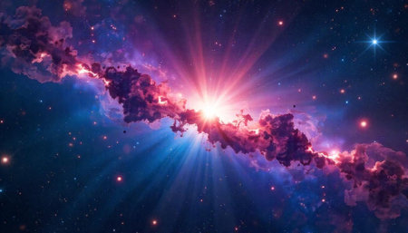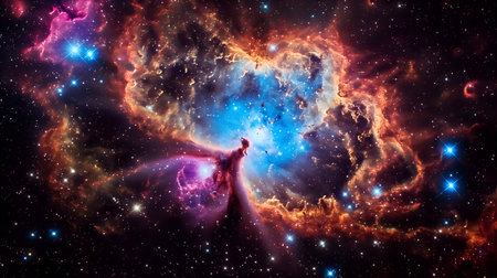 Colorful cloud nebula with stars shining bright, supernova burst in the distance, cosmic energy fills the night sky. Space science and astronomy.