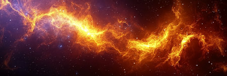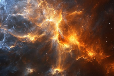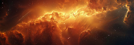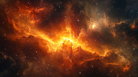 This mesmerizing image of a vibrant nebula showcases brilliant orange and yellow hues amidst a backdrop of twinkling stars, perfect for science inspiration.