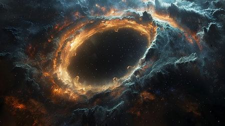 A massive black hole spins in the dark expanse of space, engulfing surrounding gas and cosmic matter, creating a luminous display of swirling energy and light in an awe-inspiring cosmic landscape. Generative AI