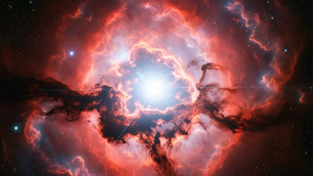 Bright showing vibrant red and orange nebula with a bright central star and dark cosmic clouds in deep space.