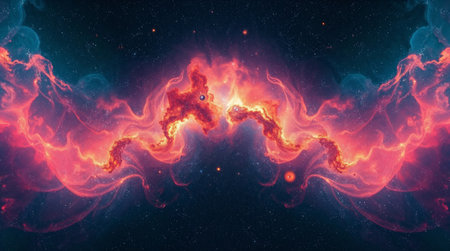 Enchanting cosmic nebula with vivid, fiery hues and intricate patterns, showcasing universes beauty