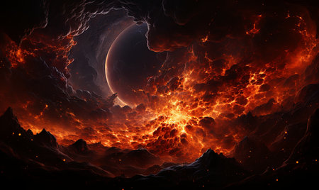 The image captures a planet partially engulfed in flames and lava, creating a dramatic fireball in the sky. The intense heat radiates outwards, illuminating the darkness of space with its fiery glow.