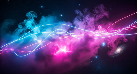 Bright neon light trails in pink, blue, and white create a dynamic, energetic composition.