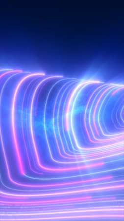 Abstract glowing neon tunnel of blue and pink waves, futuristic background symbolizing technology and flow.