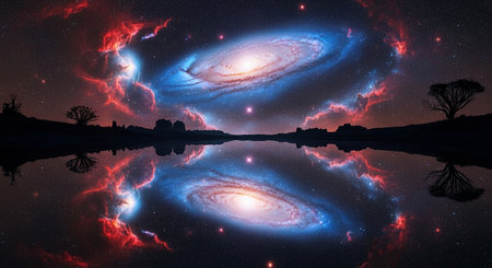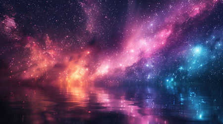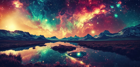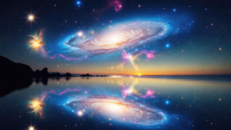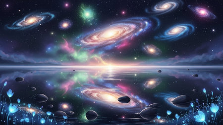 A surreal cosmic landscape with swirling galaxies and colorful nebulae reflected in a still body of water, bordered by glowing blue flowers.