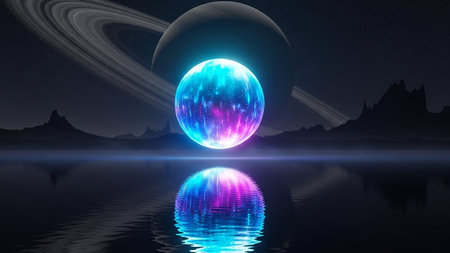 A glowing, colorful orb floats above a dark body of water, with a ringed planet in the background