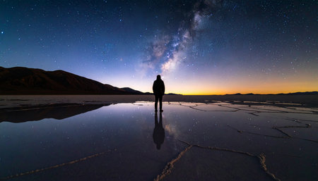 Star filled sky mirrored on Uyuni salt flats, geometric patterns, no light pollution. Surreal Salar de Uyuni concept.