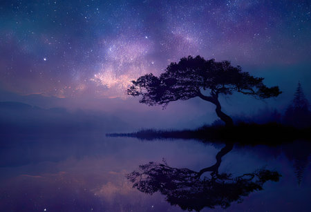 A solitary tree stands silhouetted against a vibrant night sky filled with stars and the Milky Way. Its reflection creates symmetry in the calm water. The scene uses cool tones, with purples and blues dominating, suggesting a serene atmosphere. This image could be suitable for various editorial and commercial applications.