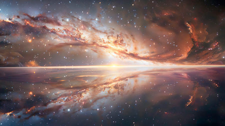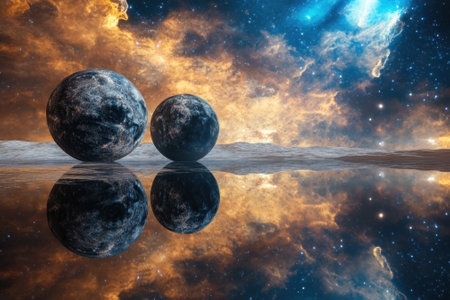 Two planets stand against a vibrant cosmic backdrop, reflecting on a tranquil surface in deep space.