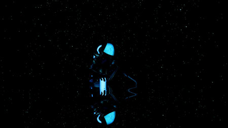Unknown robotic mechanism moving in outer space surrounded by flying particles. Design. Reflection of n alien machine in liquid substance.