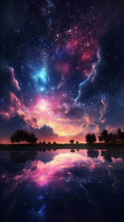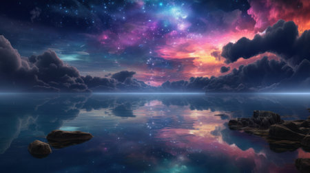 abstract night sky background with clouds and stars over a lake, vector illustration. (ai generated)