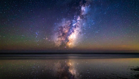 Night sky magic reflected in a tranquil lake with stars and the Milky Way