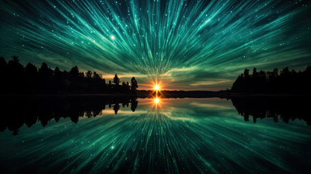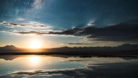 AI Generated. Landscape showing a starry sky reflected in a lake at sunset