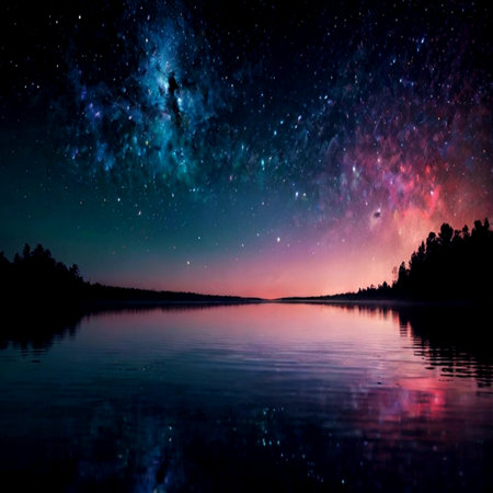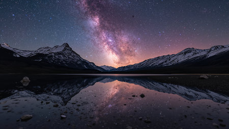 Breathtaking scene capturing a night sky filled with stars and the Milky Way reflecting on a still lake, surrounded by majestic mountains and tranquil nature.