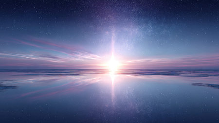 Experience a tranquil cosmic dawn where soft light meets smooth waters. This stunning landscape captures the beauty of serenity and hope in an ethereal setting.