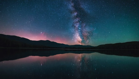 Captivating image of the Milky Way galaxy reflected in a tranquil mountain lake surrounded by silhouetted peaks under a starry night sky at dusk