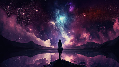 a lonely woman standing at the lake watching an impressive sky of stars and planets, generative ai technology
