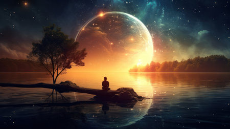 AI Generated. Lunar Serenity Scene Meditative Silhouette Under Starry Sky for Mindful Content and Wellness Branding in Tranquil Nature Settings