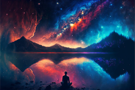 An AI generated illustration of a person meditating on the lakeshore in colorful fantasy world