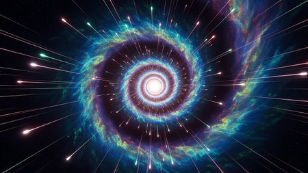 A stunning cosmic vortex swirls with vibrant colors and glowing particles, showing space's beauty during night.