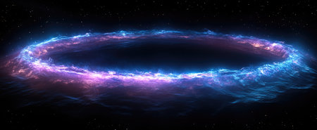 A blue and purple ring of light around an Earth-like planet in space, with a black background and stars. --ar 73:30 --stylize 750 --v 6.1 Job ID: 90d1aff5-c455-430a-9b5c-e65756b21340