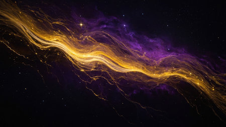 Golden and purple nebula resembling a cascade of streaks flowing through the vastness of space, creating a mesmerizing cosmic scene