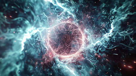 Glowing blue energy sphere dispersing particles in a digital abstract space on a dark blue background.