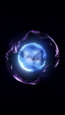 Bright core of glowing blue energy orb encased in a dark void with ethereal purple liquid strands swirling around.
