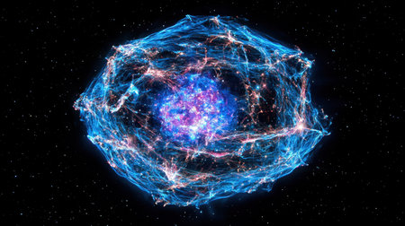 Futuristic cosmic explosion with neon blue and magenta plasma clouds in deep space. Generative
