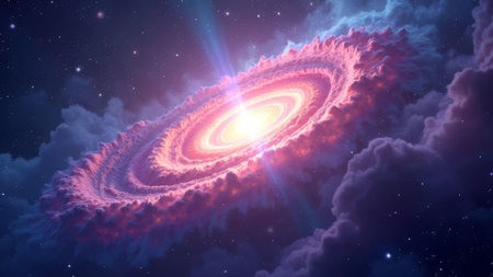 A luminous galaxy with a glowing bright core and swirling pink and orange clouds in deep space creating a dramatic and vibrant cosmic scene perfect for science and astronomy themes.