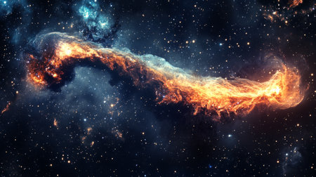 A stunning cosmic nebula showcasing dynamic orange and blue gas clouds, set against the darkness of space filled with countless stars, evoking a sense of wonder and exploration.