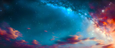 A panoramic view of the Milky Way galaxy, showcasing vibrant colors, sparkling stars, and swirling cosmic dust.