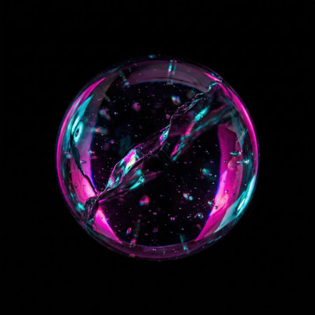 An artistic rendering presents a glowing orb in vibrant hues of blue, purple, and pink. The spherical object appears to float above a reflective surface, possibly mirroring the cosmos. The composition features a dark background, suggesting a night or space setting, creating a visually striking abstract image suitable for various commercial uses.
