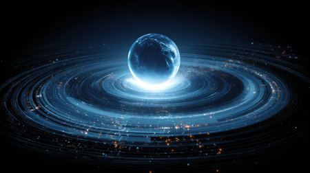 An artistic depiction presents a digitally rendered globe, encircled by illuminated rings, set against a dark backdrop. The composition showcases a sphere with textured surfaces and bright, glowing elements. This image is suitable for a variety of creative and commercial projects, illustrating concepts of technology and the digital world.