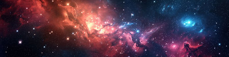 A colorful nebula glows with bright reds, oranges, and blues as stars twinkle in the expansive night sky, showing the beauty of deep space.