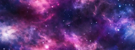 Seamless space texture background. Stars in the night sky with purple pink and blue nebula. A high resolution astrology or astronomy backdrop pattern