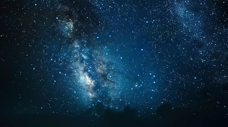 A breathtaking view of a starry night sky filled with twinkling stars and shimmering cosmic dust against a rich dark blue background, evoking calmness.