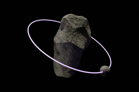 3d render abstract stone planet with glowing circle and satellite in deep space, black background