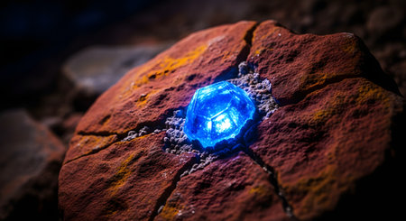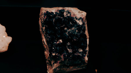 A striking mineral showcases vibrant hues and sparkling facets, illuminated under a spotlight.